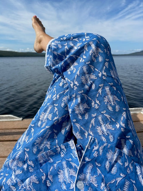 Introducing The Night Suit! Our partner in Jaipur refers to this sleepwear as Night Suits. We found the term so endearing and it has stuck! We wanted these Night Suits to be extra special so we included some nice accents: contrasting cuffs on sleeves and pants, pants pockets, drawstring waist, piping, 100% cotton that gets softer with washing, and our exclusive lobster designs. The sizing is based on maximizing coziness and comfort - they are roomy, soft and dreamy!